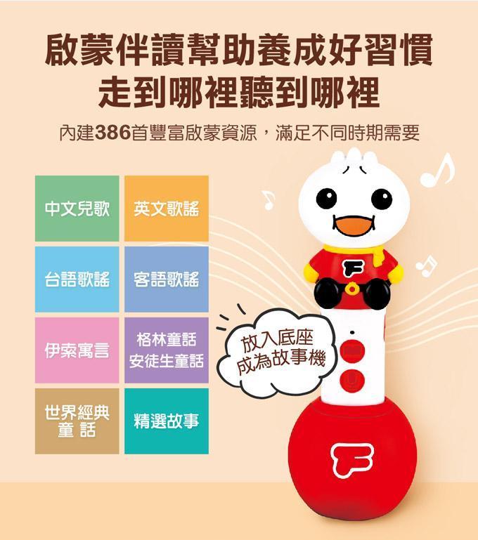 多重點讀,多重教育,用「聲音」陪伴孩子學習成長;內建386首曲目,兒歌、童話、成語故事、唐詩隨時聽。