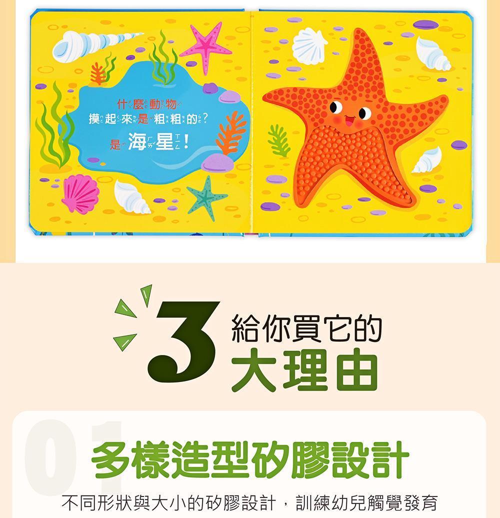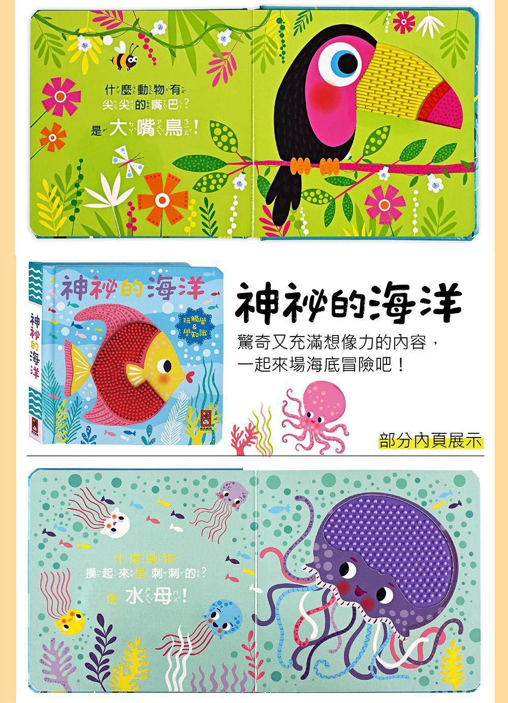 《神秘的海洋》每一頁皆有不同的海洋動物主題,搭配可愛童趣的插圖,讓孩子動手摸摸看不同海洋動物的觸感,加上鮮明漂亮的色彩,開啟豐富的知識與想像力。