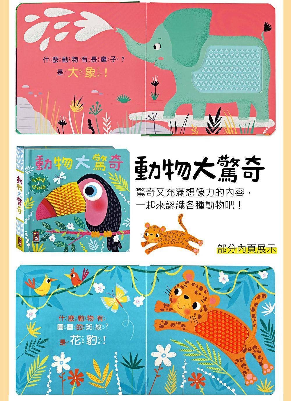 《動物大驚奇》有各種色彩繽紛的動物,包括:花豹、變色龍、猴子等,一邊閱讀有趣的主題內容,一邊觸摸各種矽膠圖案,在遊戲中多樣化學習,探索神奇的動物世界吧!